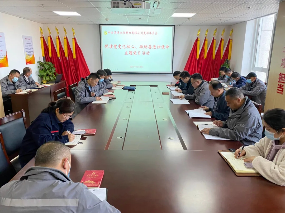 為扎實推進黨史學(xué)習教育,結(jié)合公司常態(tài)化制度化學(xué)習要求,10月25日下午,菏澤永恒熱力有限公司黨支部組織開展“悅讀黨史憶初心、砥礪奮進擔使命”主題黨日活動,黨支部書記肖培飛主持會議,全體黨員、發(fā)展對象、入黨積極分子、中層副職及以上人員參加本次會議。