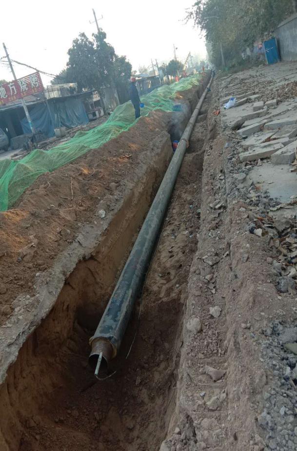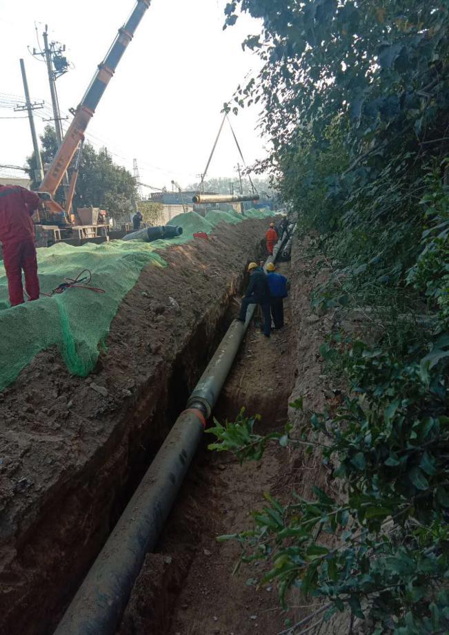 為了能夠讓電廠家屬院能夠在供暖季正常用暖,公司對(duì)該項(xiàng)目工地實(shí)行分段施工,分班次、加班加點(diǎn)搶工期。10月上旬完成了電廠北門(mén)溝槽的開(kāi)挖工作,10月16日起,開(kāi)始向溝槽下放熱力管道。