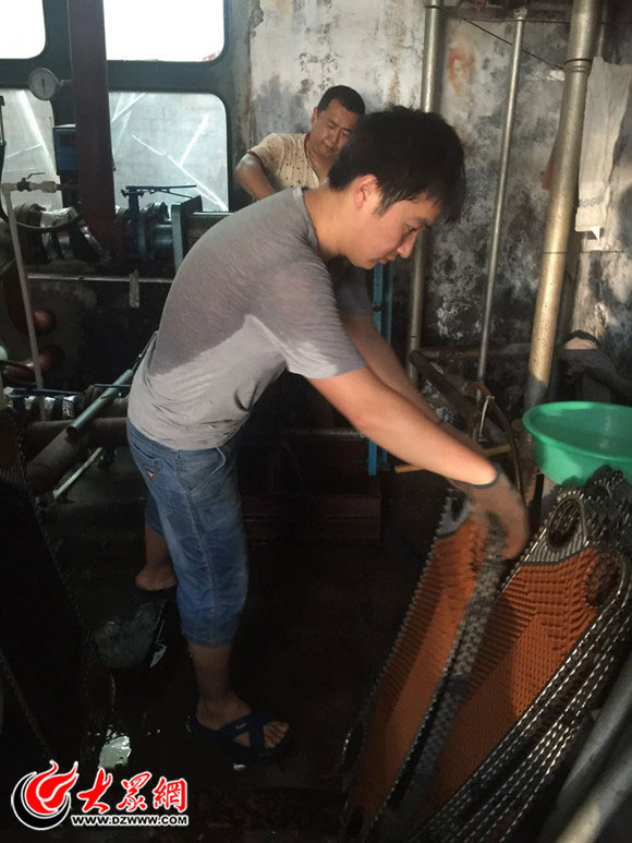 下午4時(shí)左右,大眾網(wǎng)記者來到位于丹陽路上的國稅局家屬院。家屬院角落處的供熱設(shè)備機(jī)房內(nèi)悶熱狹小,空氣流通不暢,大眾網(wǎng)記者剛進(jìn)去一小會就已經(jīng)汗流浹背。正在清洗換熱器的供暖管理員們有的光著膀子作業(yè),身上水光锃亮,有的脖子上掛著毛巾,但沒過幾分鐘剛在水管洗凈擰干的毛巾又已經(jīng)滿是汗水。