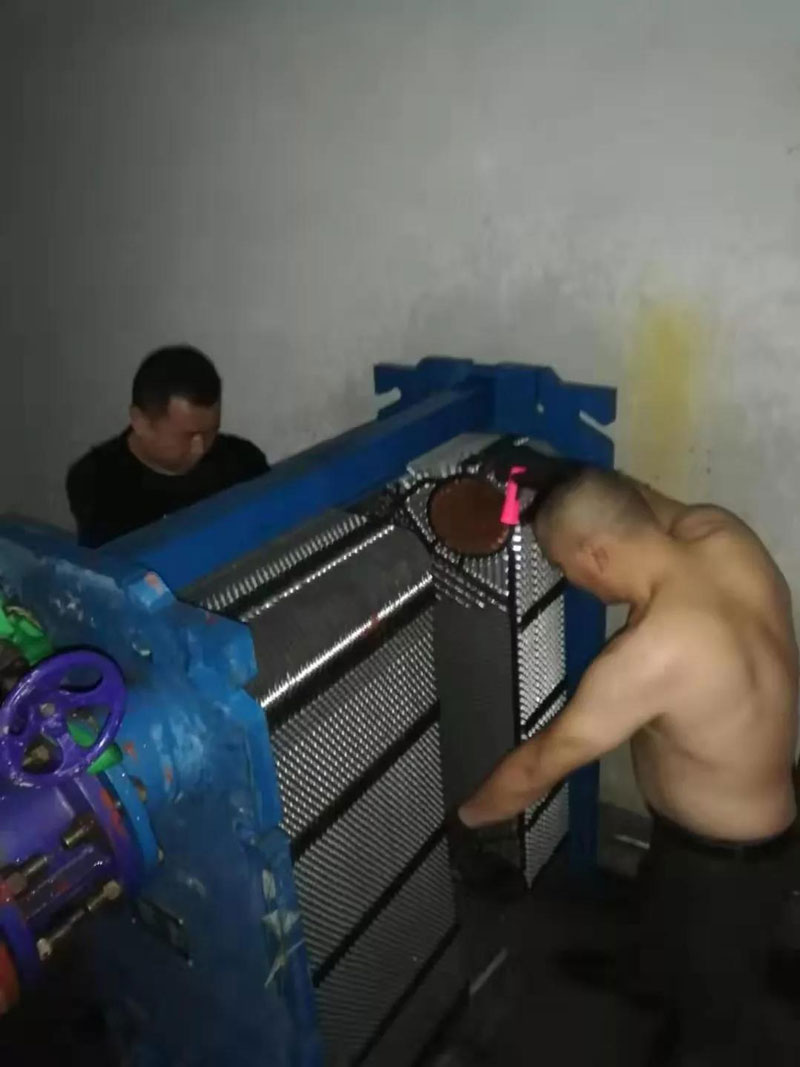 到達(dá)現(xiàn)場時(shí),泵房內(nèi)地面已經(jīng)積水約2厘米深。“一開始,我們想不拆卸換熱器,直接進(jìn)行局部堵漏,防止漏水噴濺造成泵房其他換熱機(jī)組進(jìn)水連電。因?yàn)閾Q熱器是大型設(shè)備,通常我們4個(gè)人一起配合,還需要將近6小時(shí)才能拆卸并安裝完畢,而我們只有2個(gè)人。后來發(fā)現(xiàn),在上百個(gè)緊密排列的換熱片中,漏點(diǎn)的位置十分隱蔽,難以有效進(jìn)行封堵。”