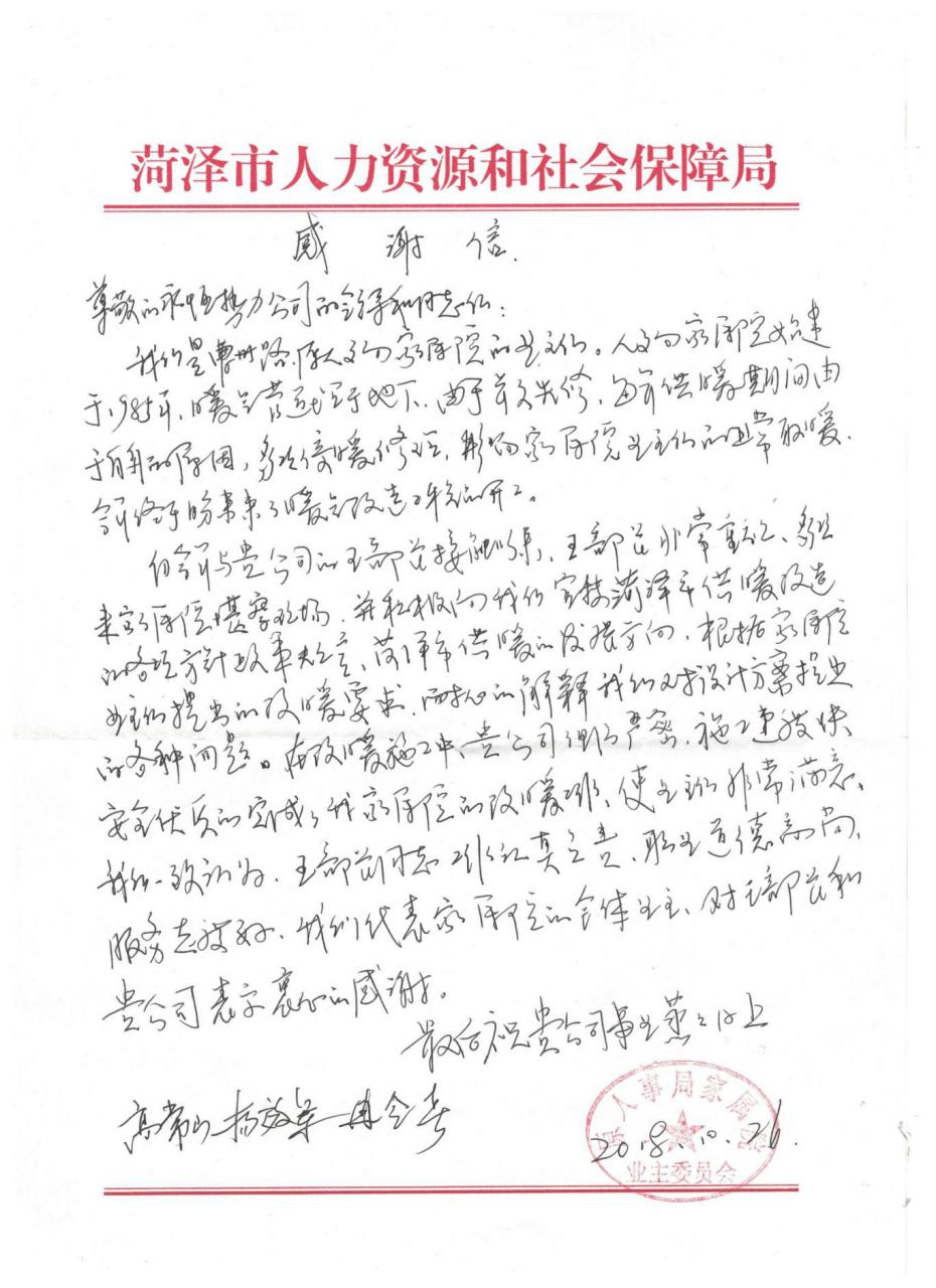 10月26日,永恒熱力辦公室收到了一封來自曹州路人事局家屬院業(yè)主委員會的感謝信。信中對永恒熱力特別是運(yùn)行管理二部的供暖服務(wù)工作給予了高度評價和贊揚(yáng)。