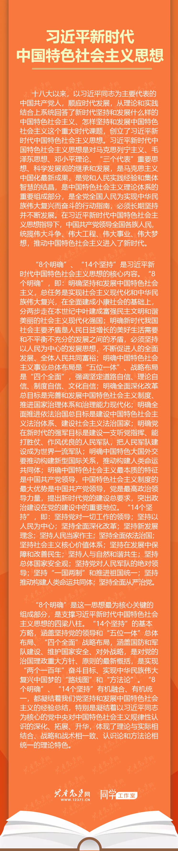 “8個明確”、“14個堅持”是習近平新時代中國特色社會主義思想的核心內(nèi)容。“8個明確”,即:明確堅持和發(fā)展中國特色社會主義,總?cè)蝿帐菍崿F(xiàn)社會主義現(xiàn)代化和中華民族偉大復興,在全面建成小康社會的基礎上,分兩步走在本世紀中葉建成富強民主文明和諧美麗的社會主義現(xiàn)代化強國;明確新時代我國社會主要矛盾是人民日益增長的美好生活需要和不平衡不充分的發(fā)展之間的矛盾,必須堅持以人民為中心的發(fā)展思想,不斷促進人的全面發(fā)展、全體人民共同富裕;明確中國特色社會主義事業(yè)總體布局是“五位一體”、戰(zhàn)略布局是“四個全面”,強調(diào)堅定道路自信、理論自信、制度自信、文化自信;明確全面深化改革總目標是完善和發(fā)展中國特色社會主義制度、推進國家治理體系和治理能力現(xiàn)代化;明確全面推進依法治國總目標是建設中國特色社會主義法治體系、建設社會主義法治國家;明確黨在新時代的強軍目標是建設一支聽黨指揮、能打勝仗、作風優(yōu)良的人民軍隊,把人民軍隊建設成為世界一流軍隊;明確中國特色大國外交要推動構(gòu)建新型國際關系,推動構(gòu)建人類命運共同體;明確中國特色社會主義最本質(zhì)的特征是中國共產(chǎn)黨領導,中國特色社會主義制度的最大優(yōu)勢是中國共產(chǎn)黨領導,黨是最高政治領導力量,提出新時代黨的建設總要求,突出政治建設在黨的建設中的重要地位。“14個堅持”,即:堅持黨對一切工作的領導;堅持以人民為中心;堅持全面深化改革;堅持新發(fā)展理念;堅持人民當家作主;堅持全面依法治國;堅持社會主義核心價值體系;堅持在發(fā)展中保障和改善民生;堅持人與自然和諧共生;堅持總體國家安全觀;堅持黨對人民軍隊的絕對領導;堅持“一國兩制”和推進祖國統(tǒng)一;堅持推動構(gòu)建人類命運共同體;堅持全面從嚴治黨。