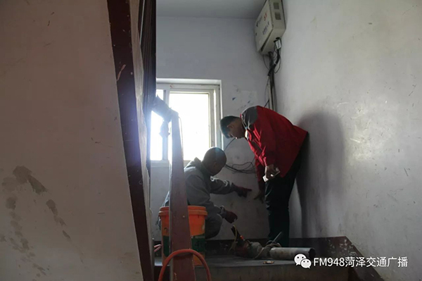 管道入戶,打眼,任永輝提醒工人一定要在打眼后,把衛(wèi)生收拾好。