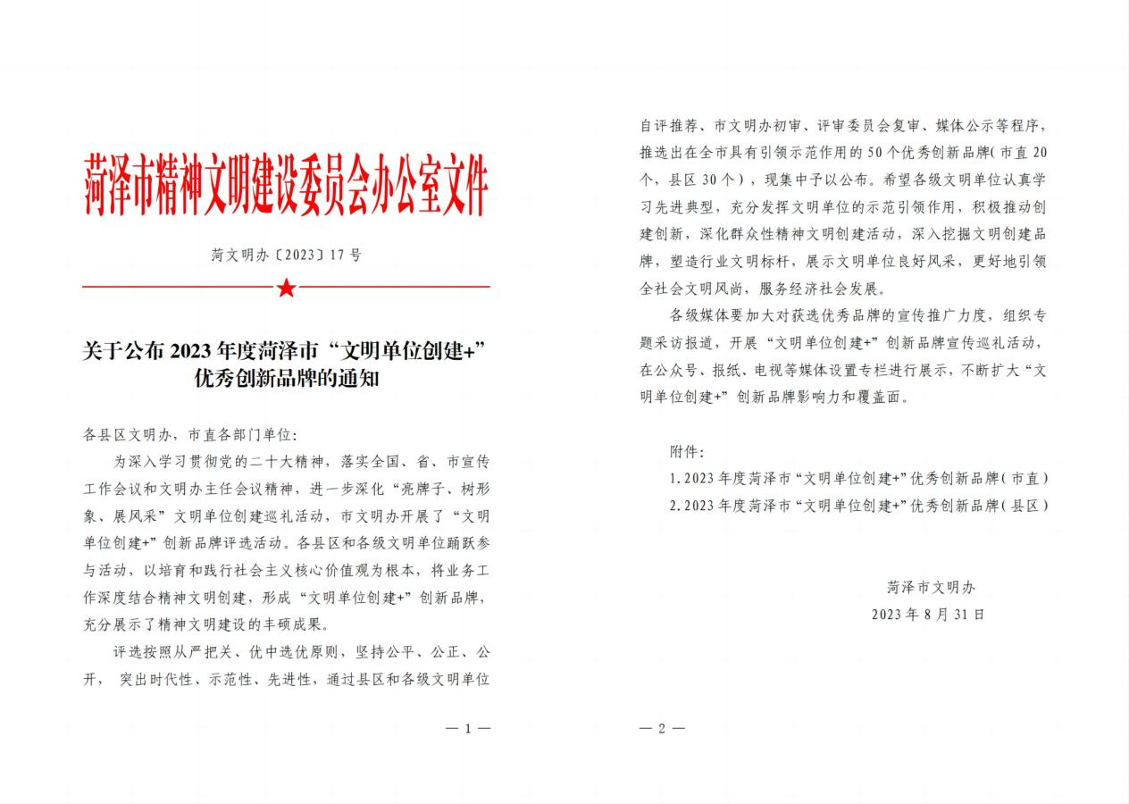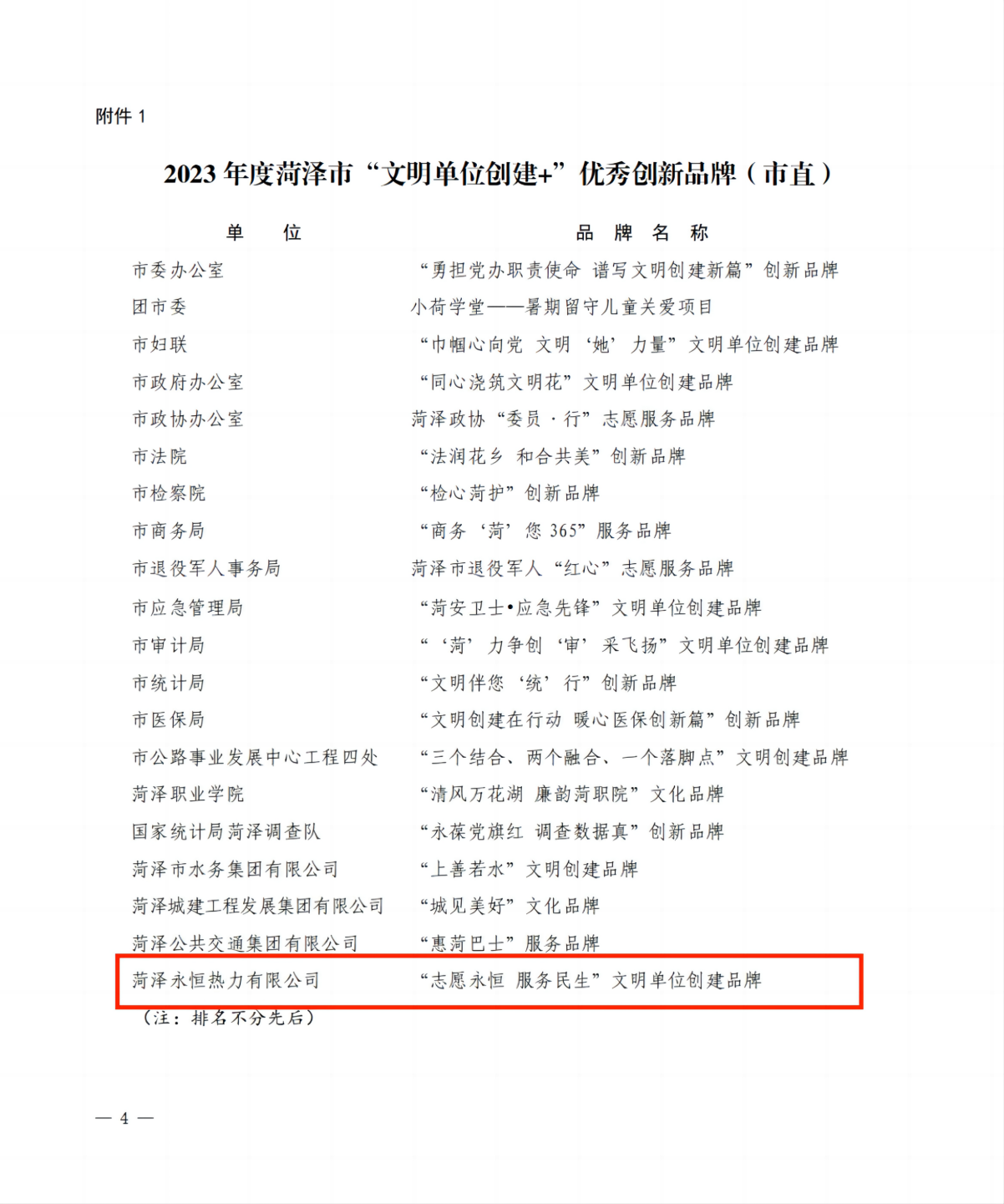 8月31日,菏澤市文明辦下發(fā)《關(guān)于公布2023年度菏澤市“文明單位創(chuàng)建+”優(yōu)秀創(chuàng)新品牌的通知 》,菏澤永恒熱力有限公司“志愿永恒 服務民生”文明創(chuàng)建品牌榮獲2023年度菏澤市“文明單位創(chuàng)建+”優(yōu)秀創(chuàng)新品牌。